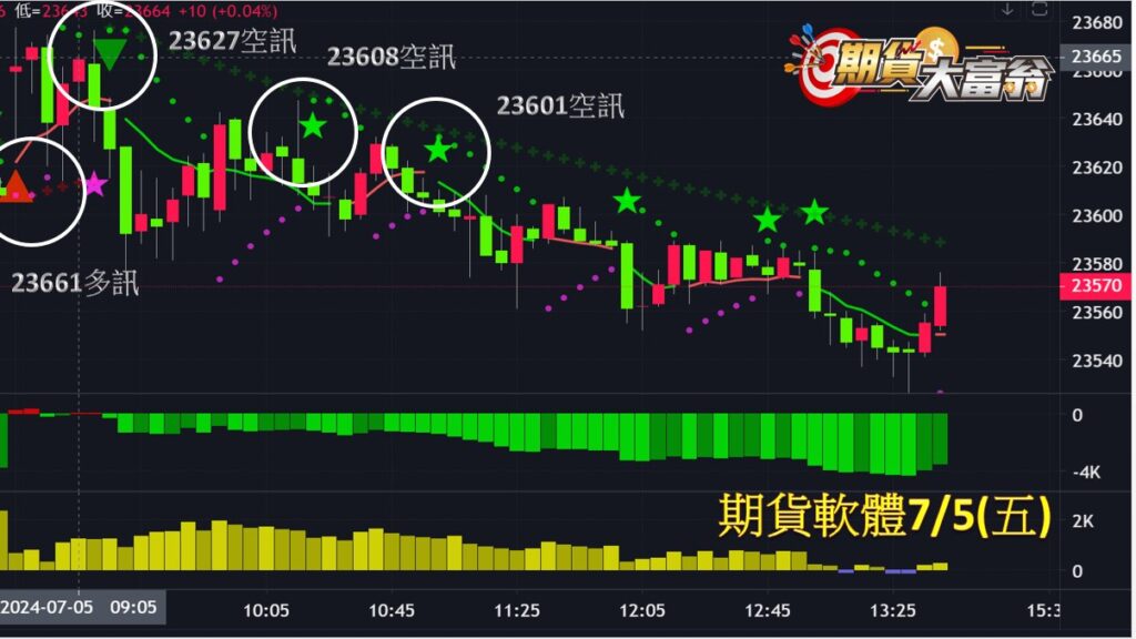 台指期今日走勢偏空向下,共有5次進場操作機會, 第1、2次分別於早盤23990、23938點出現空訊作空,直至…