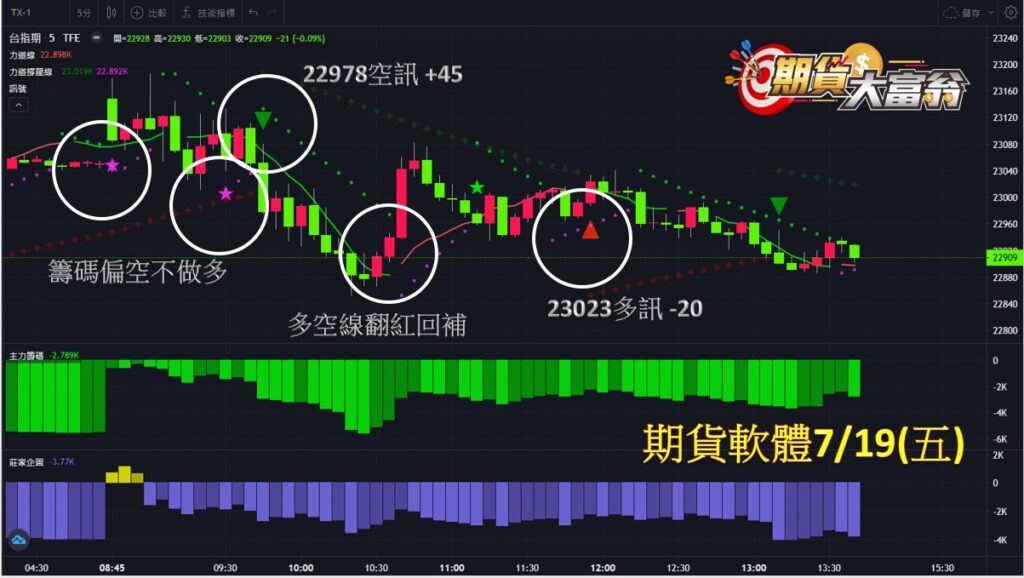 台指期今日走勢向下偏弱,共有2次進場操作機會, 第1次於早盤22978點出現空訊作空,直至多空線翻紅回補,獲利…