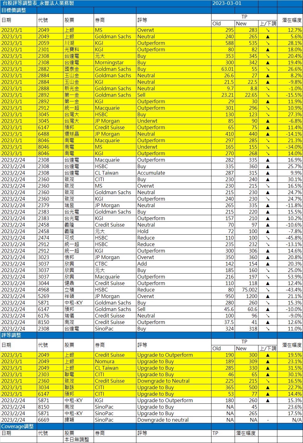 近期外資與國內外機構對個股評等的調整