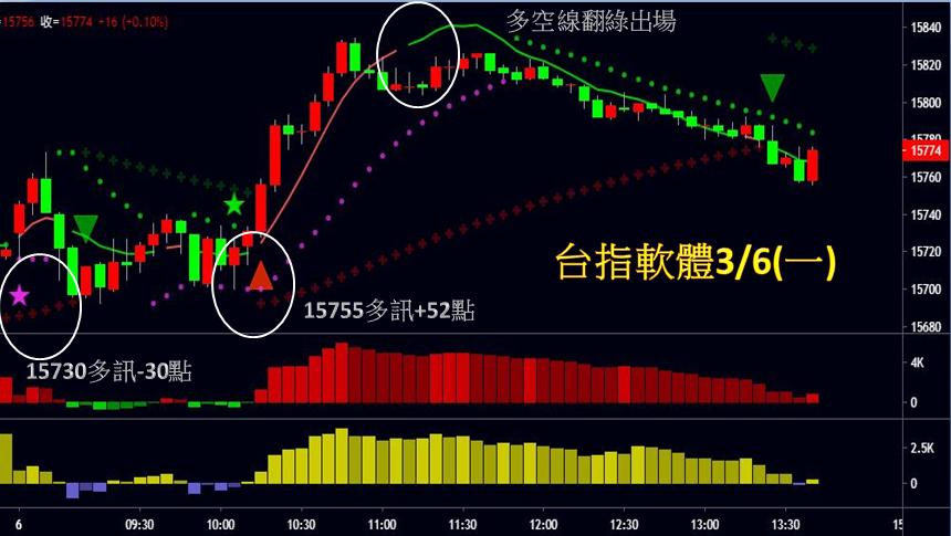 今天提醒軟體會員,只做多,早盤第一筆小損,盤中出現紅三角形買訊急拉獲利
