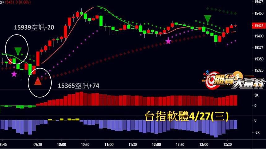 今天期指軟體掌握得也不錯,開盤空訊小虧,但15365出現買訊後急拉獲利75點入袋