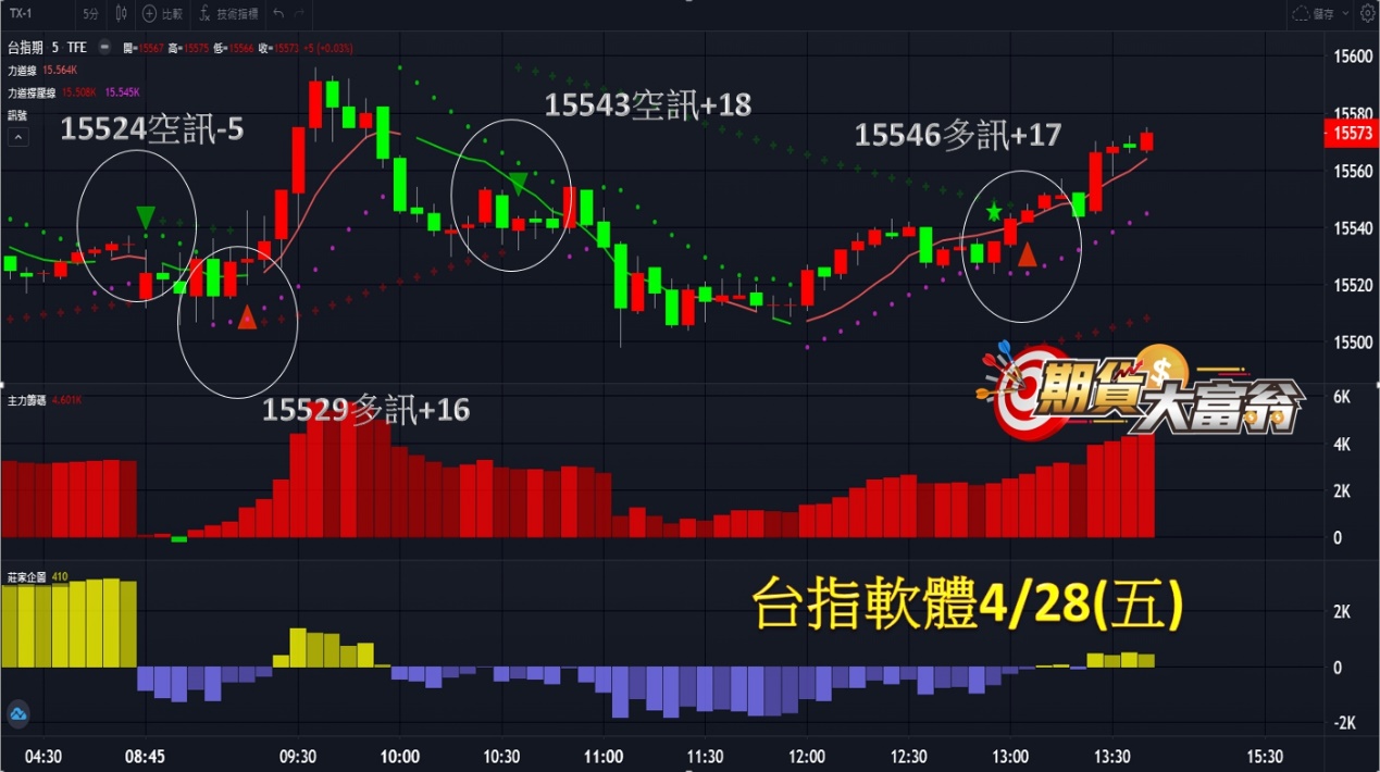 今日台指期早盤如預期開高後容易有賣壓,上漲後隨即陷入整理,今天行情多空較勁之下,軟體出現多次訊號,多、空訊號各出現2次,如都按訊號進場操作,總計可賺約46點。