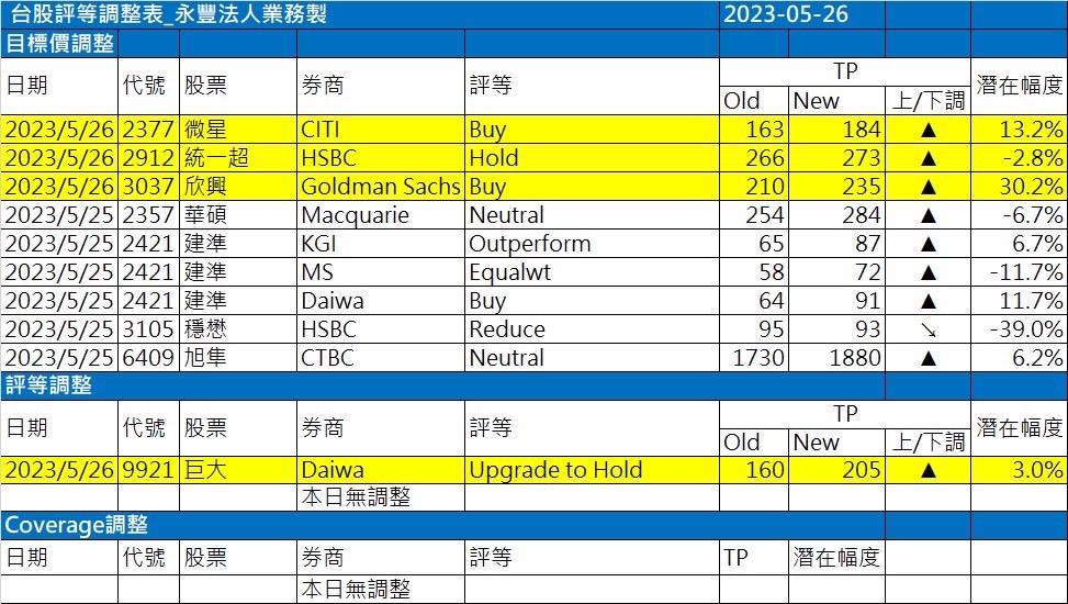近期外資與國內外機構對個股評等的調整