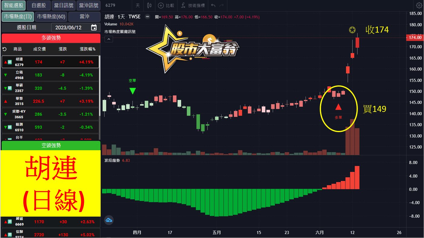 善用台指期6/1~12小時線,於6/2利用紅色三角形買訊進場多單,於6/8綠色三角形賣訊出場,總共獲利209點,6/9買訊再度於16849出現進場,放至今日收盤前高點17228,共獲利379點