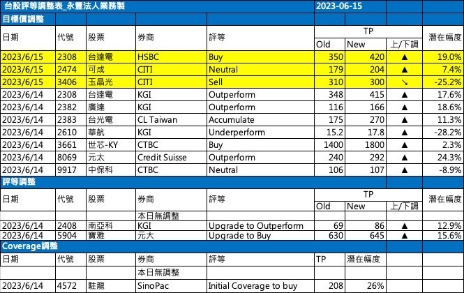近期外資與國內外機構對個股評等的調整
