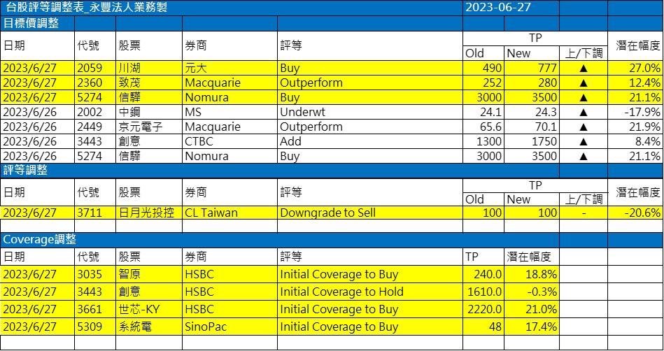近期外資與國內外機構對個股評等的調整