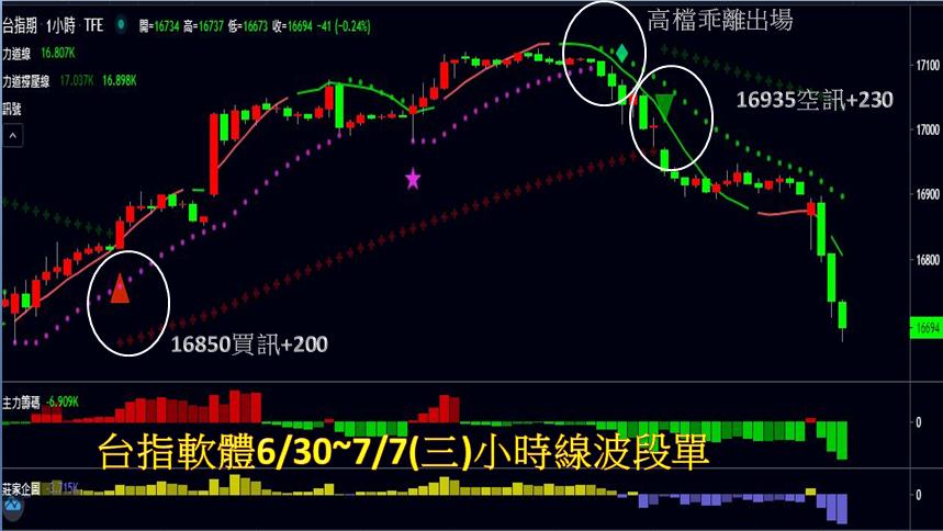 這波用軟體小時線操作波段單獲利可觀,從指標翻多後先獲利200點,昨日16935指標翻空後又可獲利230點