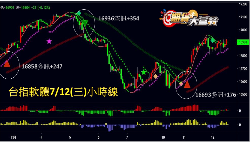 從台指期小時線來看,七月以來共出現三次訊號,二次多訊、一次空訊,按訊號操作累計可獲利777點。