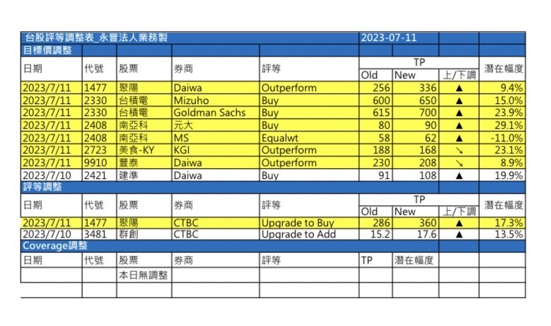 近期外資與國內外機構對個股評等的調整