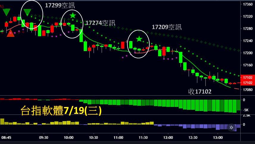 今天走勢一路偏空,軟體有3個空方進場點,第一次可在17299點進場做空,下跌至17274出現第二次空點,一路下跌至17209出現第三次空點,終場17102回補,三次空點皆有100點以上的獲利。