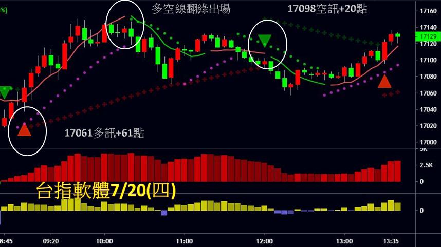 台指期今天走勢震盪,整場出現2個進場點,第一次在早盤17061點進場做多,搭配籌碼偏多操作,上漲至多空線翻綠出場,可獲利61點;第二次於午盤17098點進場做空,下跌至多空線翻紅出場,可獲利20點,累計二次進場可獲利81點。