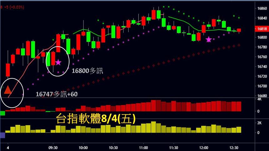 台指期今天開低走高、明顯偏多,全場有2個進場點,第一次在早盤16747點進場做多,可小幅獲利60點,第二次可在16800點進場做多,總計今天可獲利60點。