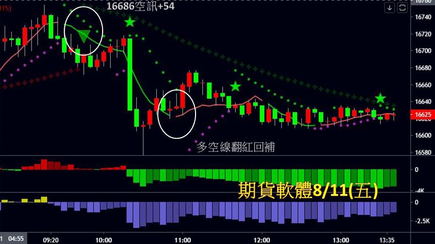 台指期今天走勢明顯偏空,可以在早盤16686點進場做空,一直到多空力道線翻紅時回補出場,可獲利54點。