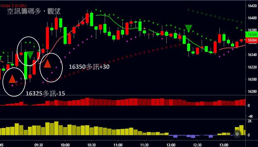 台指期今天走勢上下震盪,全場有2次進場點,第一次在早盤16325進場做多,直到多空力道線翻綠時出場,小幅虧損15點;第二次在隨即的16350進場做多,直到多空力道線翻綠時出場,可獲利30點,總計今日操作仍可獲利15點,而空訊出現時由於籌碼力道偏多,故保持觀望不進場。