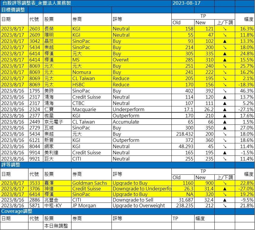 近期外資與國內外機構對個股評等的調整