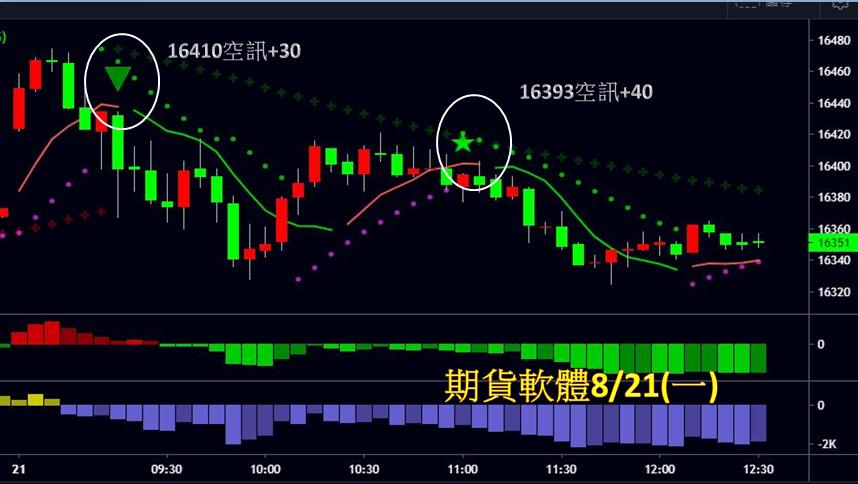 台指期今天走勢震盪走弱,全場有2次進場點,第一次在早盤16410進場做空,直到多空力道線翻紅時出場,獲利達30點;第二次在午盤16393進場做空,直到多空力道線翻紅時出場,獲利達40點,總計今日獲利為70點。
