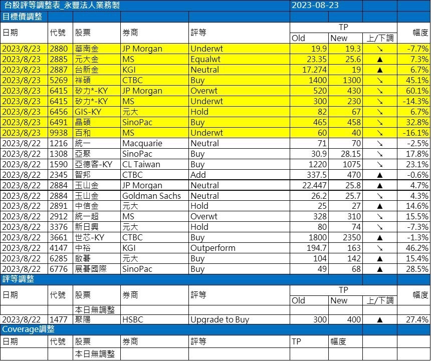 近期外資與國內外機構對個股評等的調整