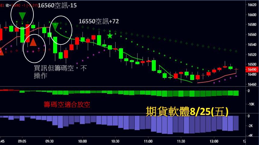 台指期今天走勢明顯偏弱,全場出現2次進場點,第一次於早盤16560出現空訊進場作空,至買訊出現回補,小虧15點,買訊因籌碼偏空故不操作;第二次於16550再度出現空訊時進場作空,直到多空力道線翻紅時出場,獲利達72點,總計今日仍可獲利57點。