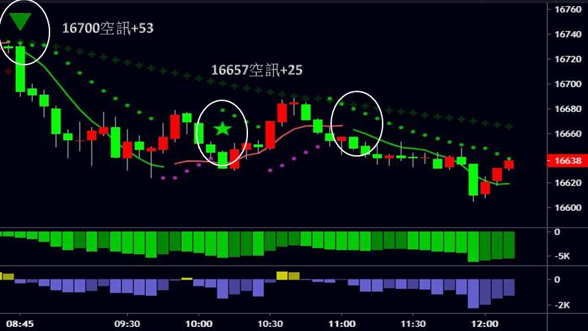 台指期今天走勢震盪向下,全場有2次進場點,第一次於早盤16700出現空訊作空,至多空力道線翻紅出場,獲利可達53點;第二次於16657出現空訊,但需延至11:00附近力道線翻綠時才進場作空,直到接近收盤前以市價回補,可小幅獲利25點,總計今日共可獲利78點。