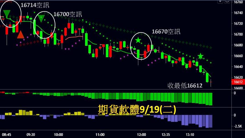 台指期今天走勢一路向下,全場有多達3次作空機會,第一次可於開盤16714出現空訊時作空,第二次空訊則於16700出現,第三次空訊於午盤16670出現,最終台指期收最低16612點,有利偏空操作。
