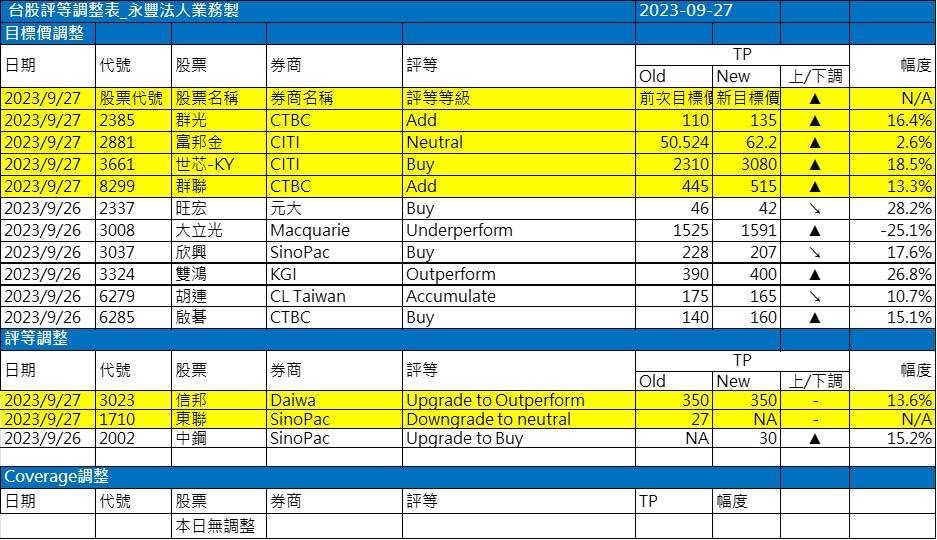 近期外資與國內外機構對個股評等的調整