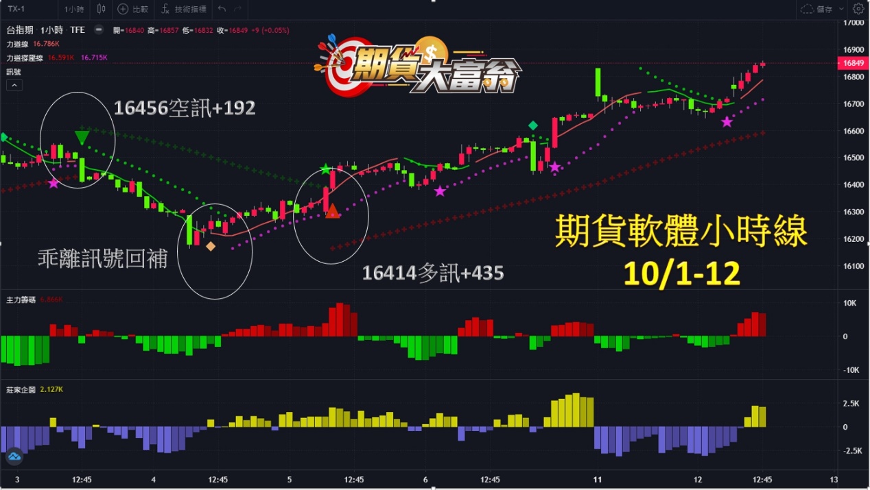 台指期小時線,從上週至今走勢先下後上,共出現2次波段操作機會,第一次於3日16456出現空訊作空,直至乖離訊號出現回補出場,可獲利高達192點;第二次於5日16414出現多訊作多,直至今日接近收盤時市價出場,更可獲利高達435點,總計獲利高達627點。