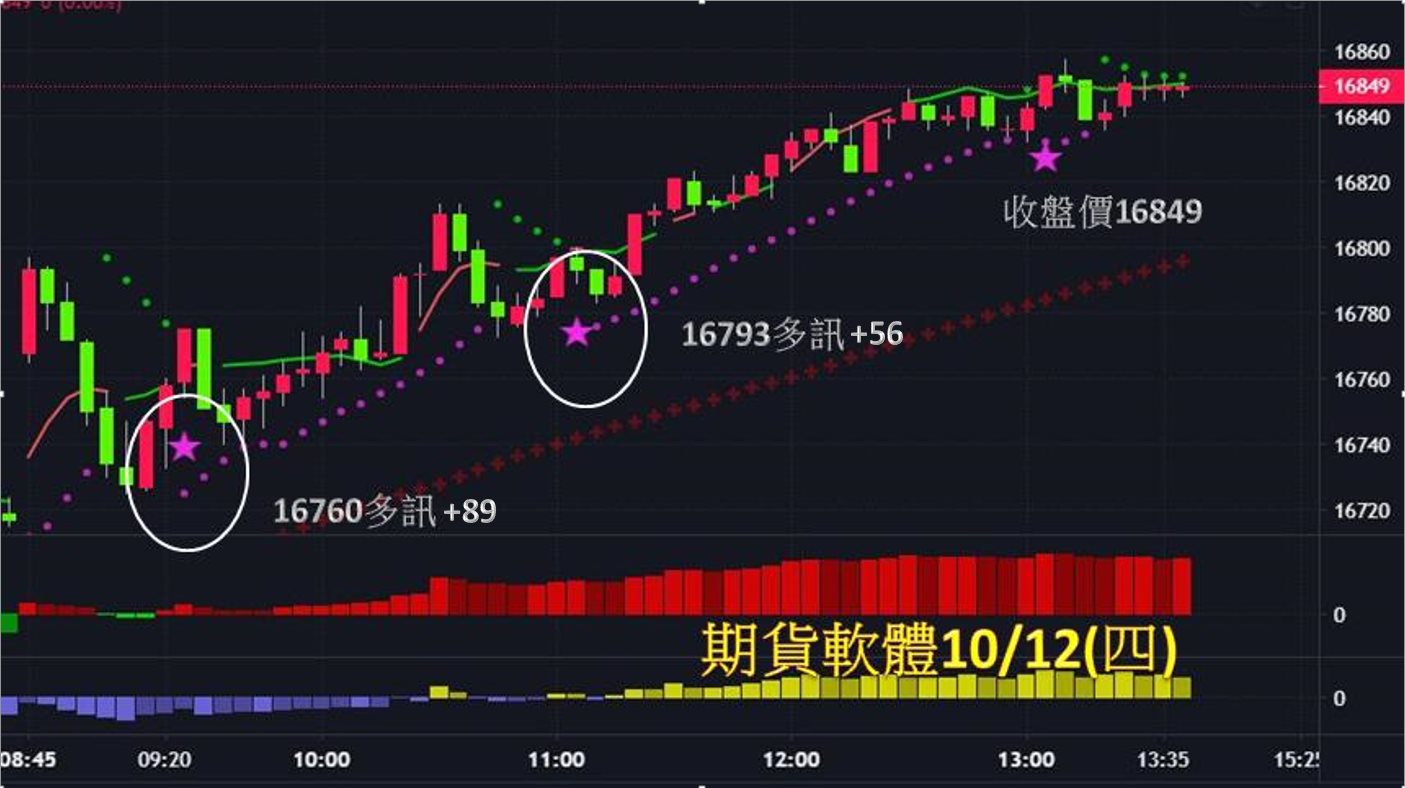 台指期日K線,今天走勢一路向上,全場共2次進場點,第一次於早盤16760出現多訊作多;第二次可於隨後的16793出現多訊作多,直至尾盤接近收盤時出場,分別可獲利89、56點。