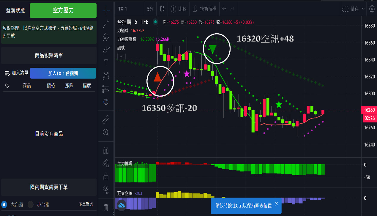台指期今天走勢先上後下,全場有2次進場機會,第一次於開盤16350出現多訊作多,直至多空力道線翻綠出場,此次虧損20點;第二次隨即於16320出現空訊作空,直至多空力道線翻紅出場,此次獲利48點,總計今日獲利28點。