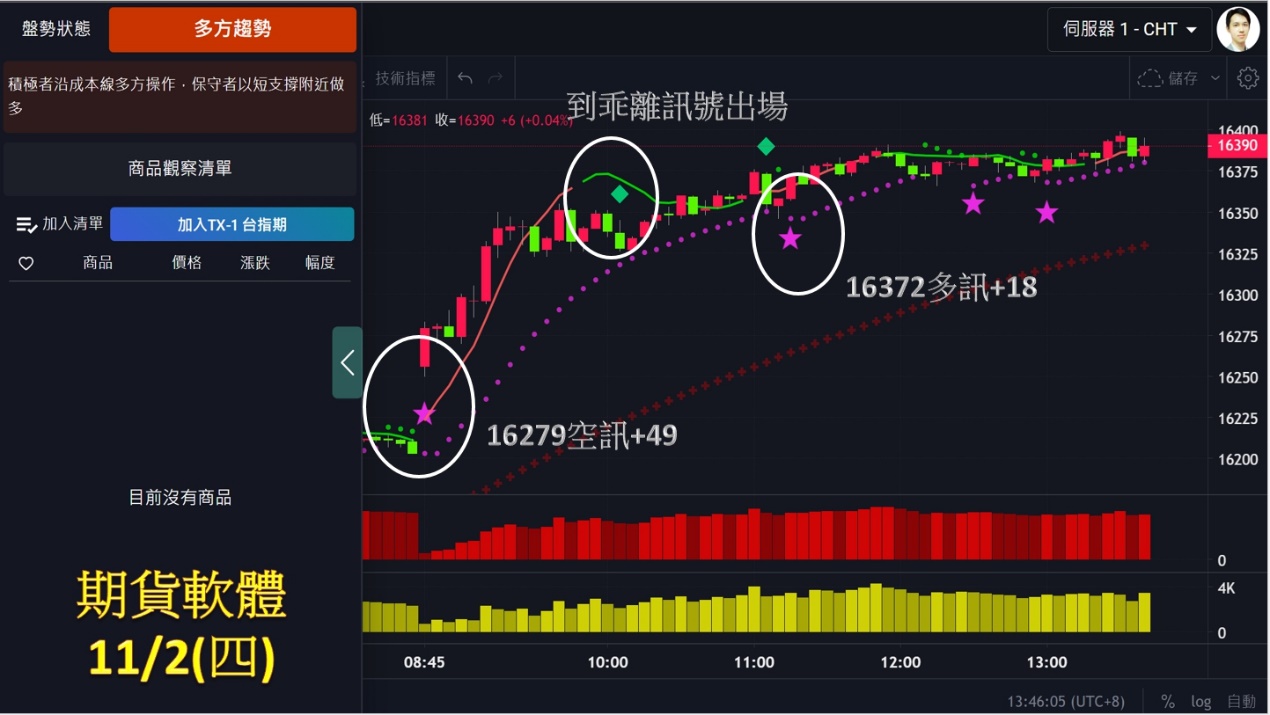台指期今天走勢一路向上,全場有2次進場機會,第一次於開盤16279出現多訊作多,直至乖離訊號出場,可獲利約49點;第二次於16372出現多訊作多,直至接近收盤以市價出場,獲利約18點,總計今日共獲利67點。