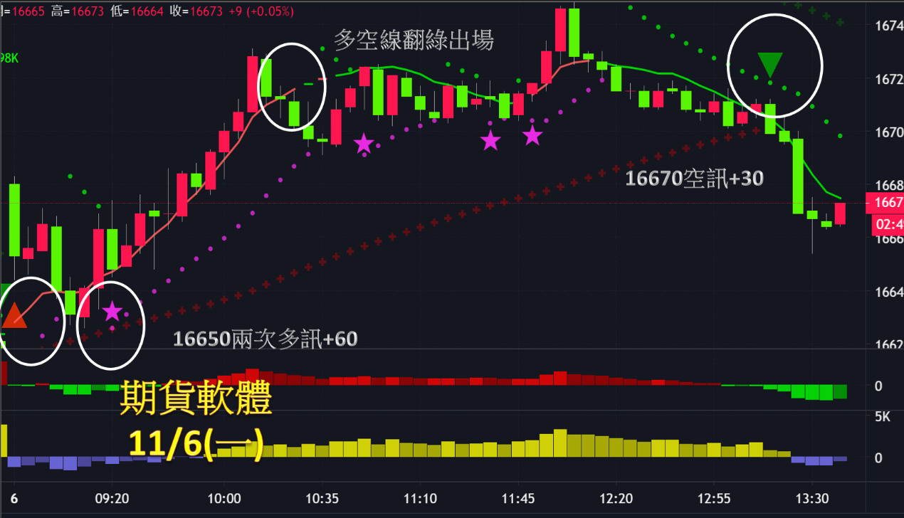 台指期今天走勢先上後下,全場有2次進場機會,第一次於開盤16650出現2次多訊作多,直至多空線翻綠出場,可獲利60點;第二次於尾盤16670出現空訊作空,至接近收盤前市價出場,獲利約30點,總計今日累計獲利達90點。