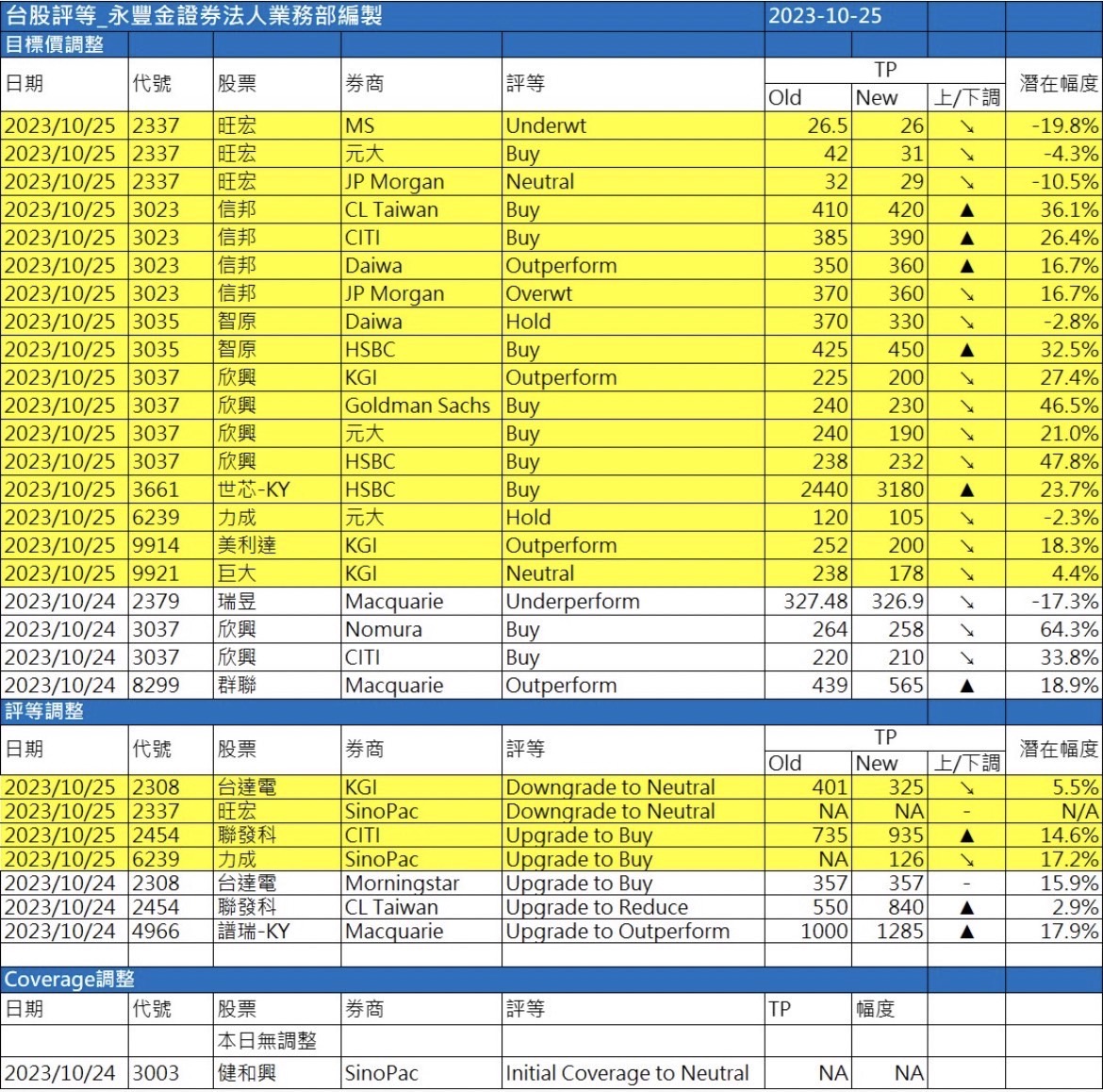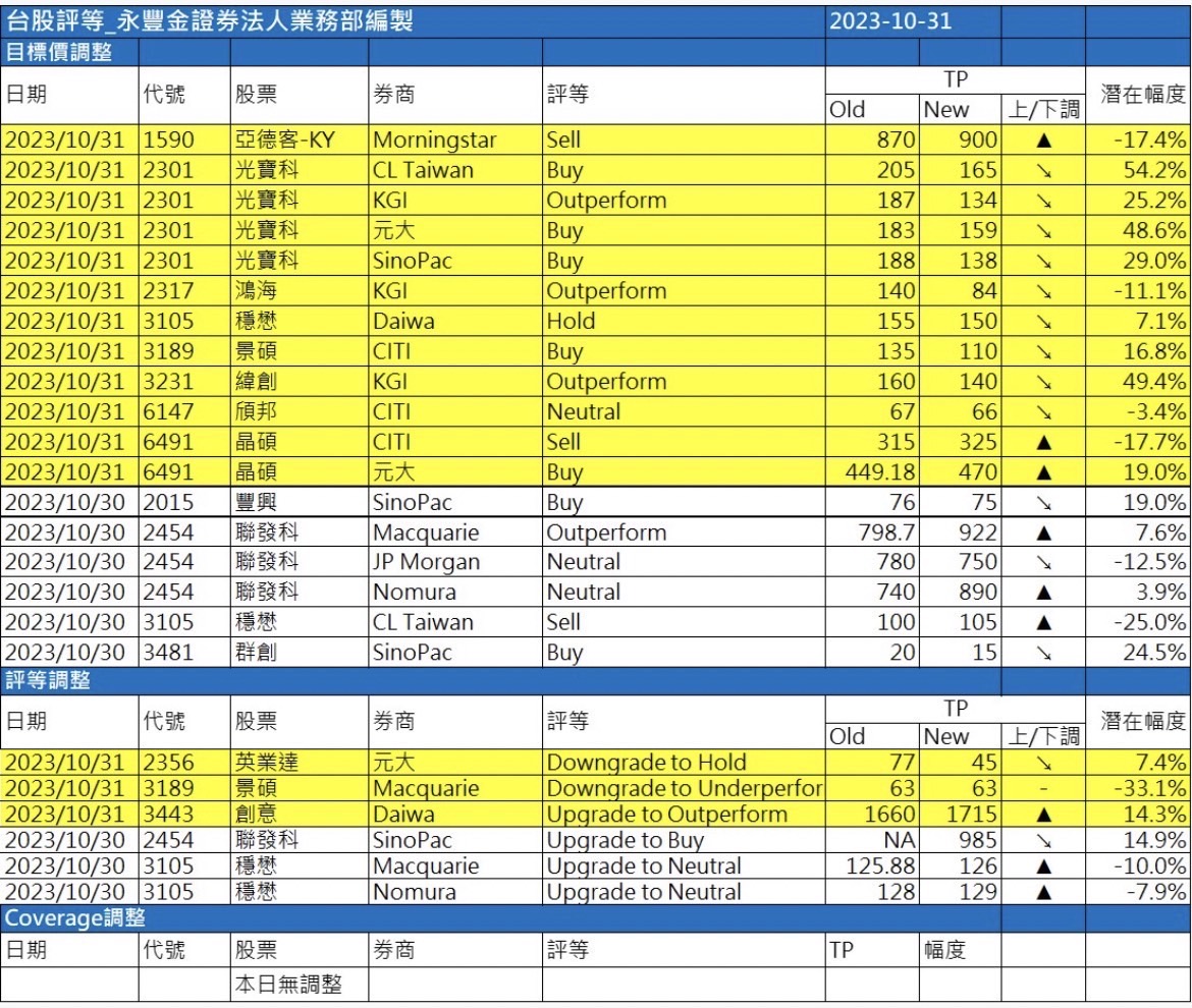 近期外資與國內外機構對個股評等的調整