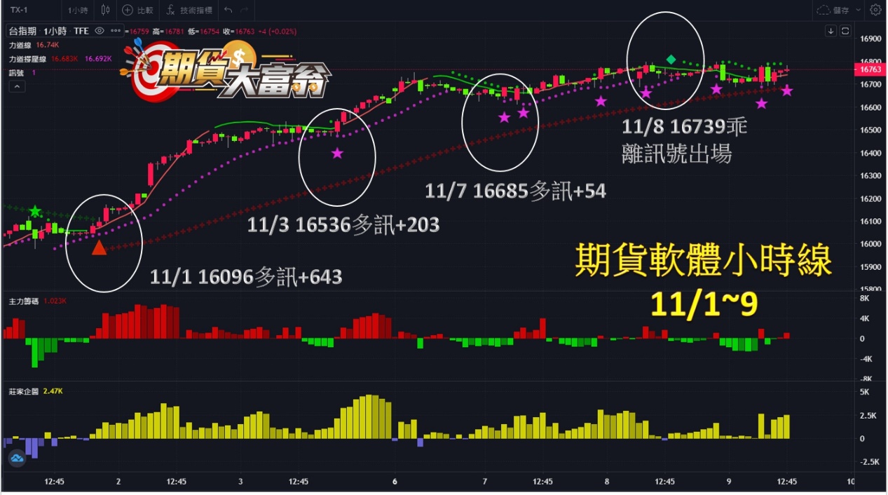 台指期11/1~9走勢一路向上,期間共有3次進場機會,第一次於11/1 16096出現多訊作多,直至11/8 16739乖離訊號出現出場,可獲利653點;第二次於11/3 16536出現多訊作多,直至11/8 16739乖離訊號出現出場,可獲利203點;第三次於11/7 16685出現多訊作多,直至11/8 16739乖離訊號出現出場,可獲利54點,這一波下來累計可獲利高達900點。