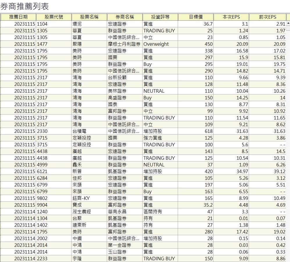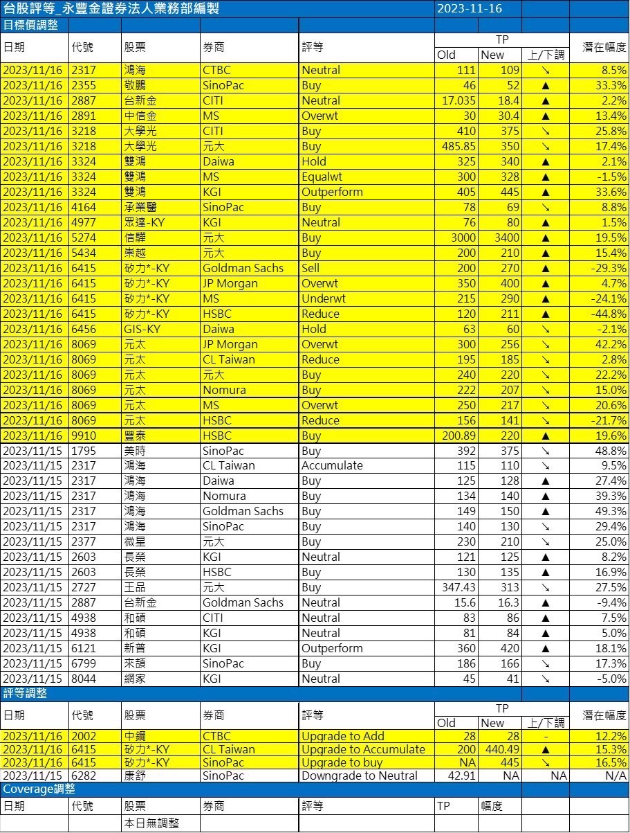 近期外資與國內外機構對個股評等的調整