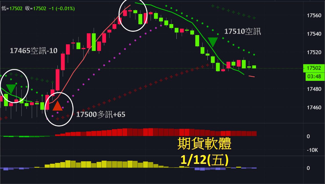 今日台指期上下震盪,全場有3次進場機會,首先於開盤17465出現空訊作空,雖小賠10點;然而,隨後於17500出現多訊時作多,直至多空力道線翻綠出場,獲利65點;最後,於17510出現空訊作空,至收盤前以市場回補,小幅獲利8點,總計今日操作共可獲利63點。