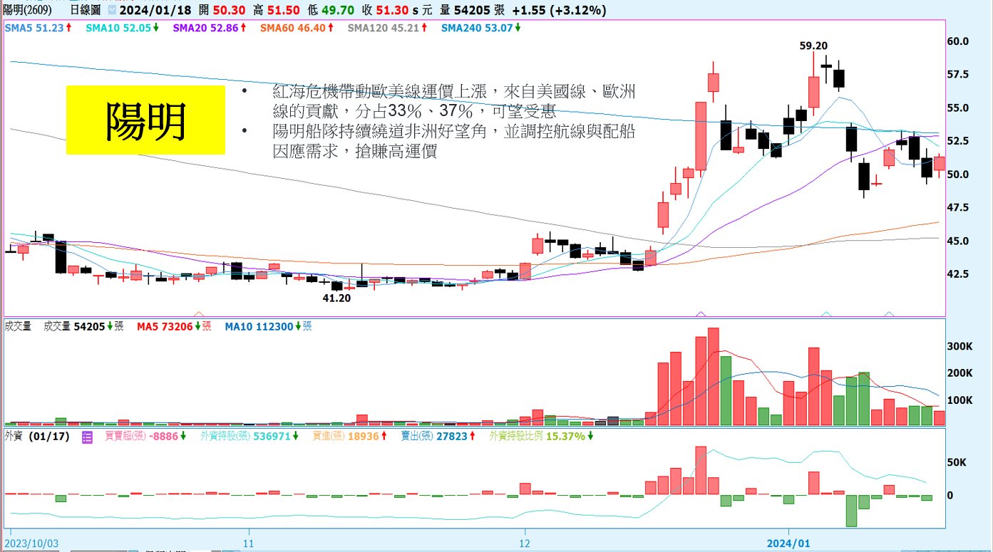 紅海危機帶動歐美線運價上漲,來自美國線、歐洲線的貢獻,分占33%、37%,可望受惠