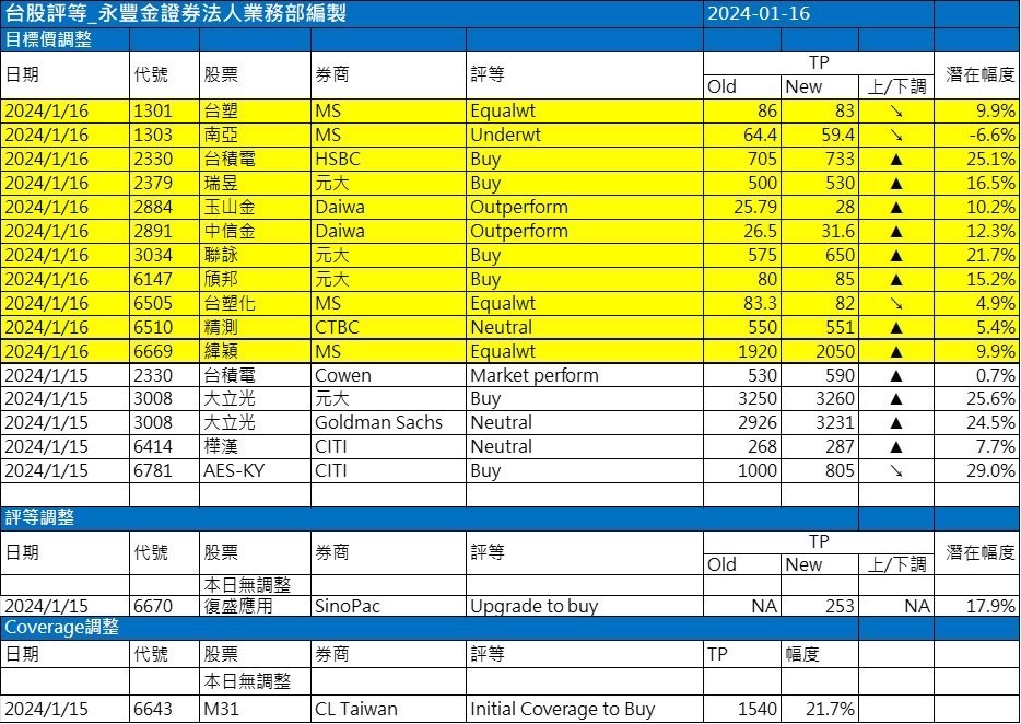 近期外資與國內外機構對個股評等的調整