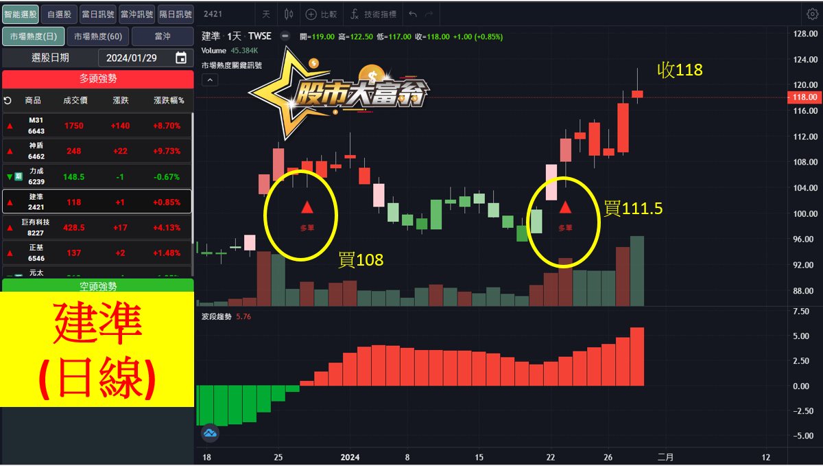 從小時線來看,台指期自1/18起走勢一路向上偏多,有多次進場機會,可先於17352出現多訊後開始作多,中間出現多次星號可一路加碼,一直到空訊出現出場,獲利達723點;隨後於18096再次出現多訊後作多;波段操作總計共可獲利723點。
