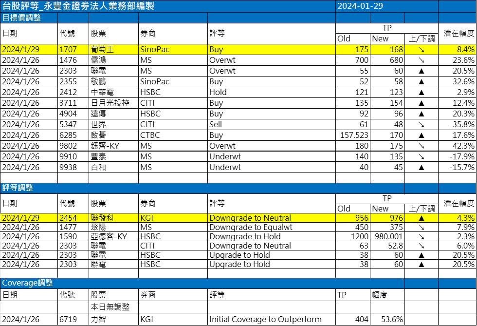 近期外資與國內外機構對個股評等的調整