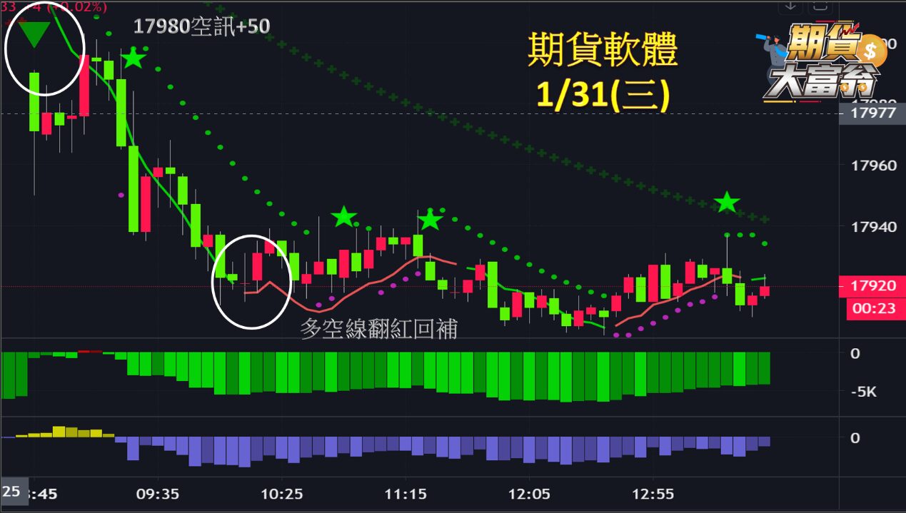 台指期今日走勢偏空一路下行,有1次進場機會,可於開盤17980出現空訊後作空,一直到多空線翻紅後回補出場,獲利50點;總計今日操作共獲利50點。