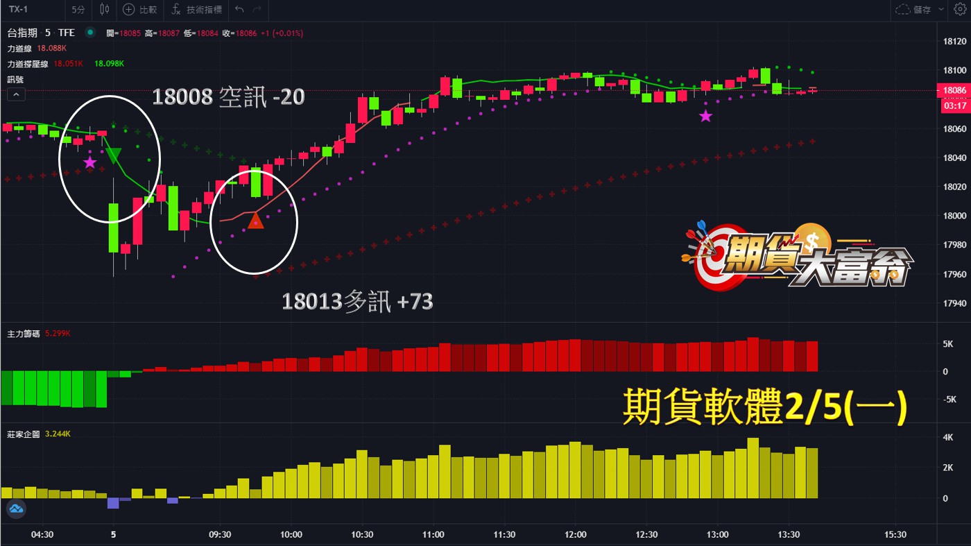 台指期今日走勢震盪、先下後上,全場有2次進場機會,首先於早盤18008出現空訊作空,虧損20點;第二次於隨後18013出現多訊作多,到接近收盤前以市價出場,獲利約73點;總計今日操作共獲利53點。