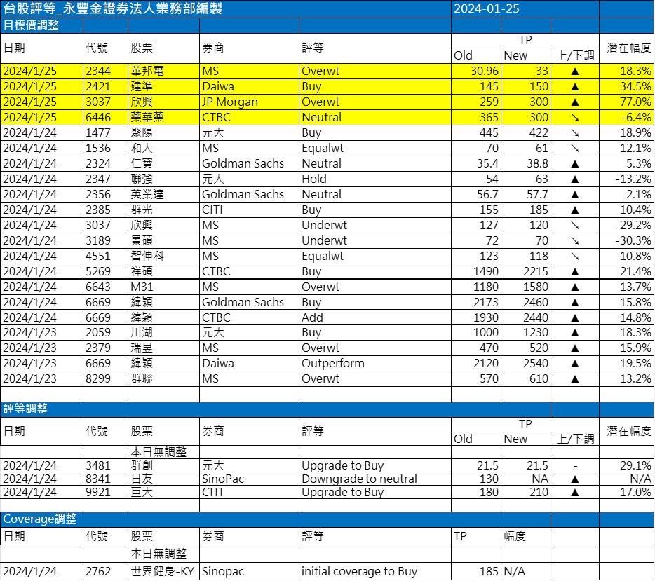 近期外資與國內外機構對個股評等的調整