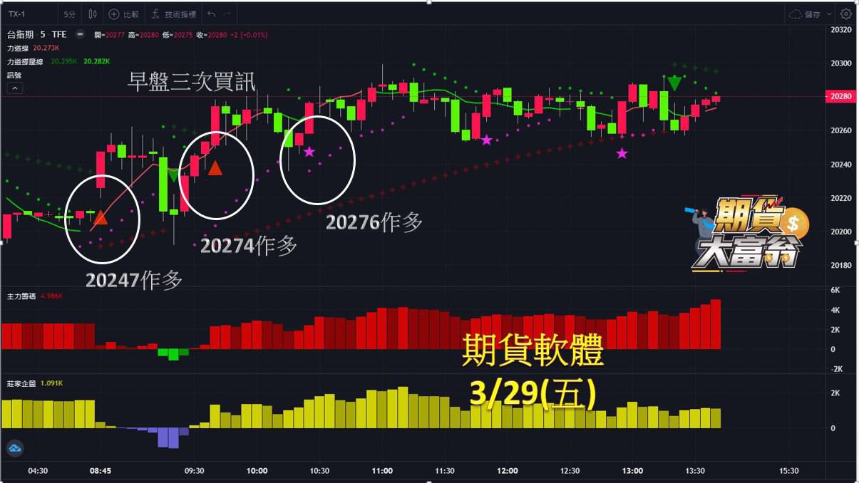 台指期今日走勢偏多向上,早盤有3次買訊,