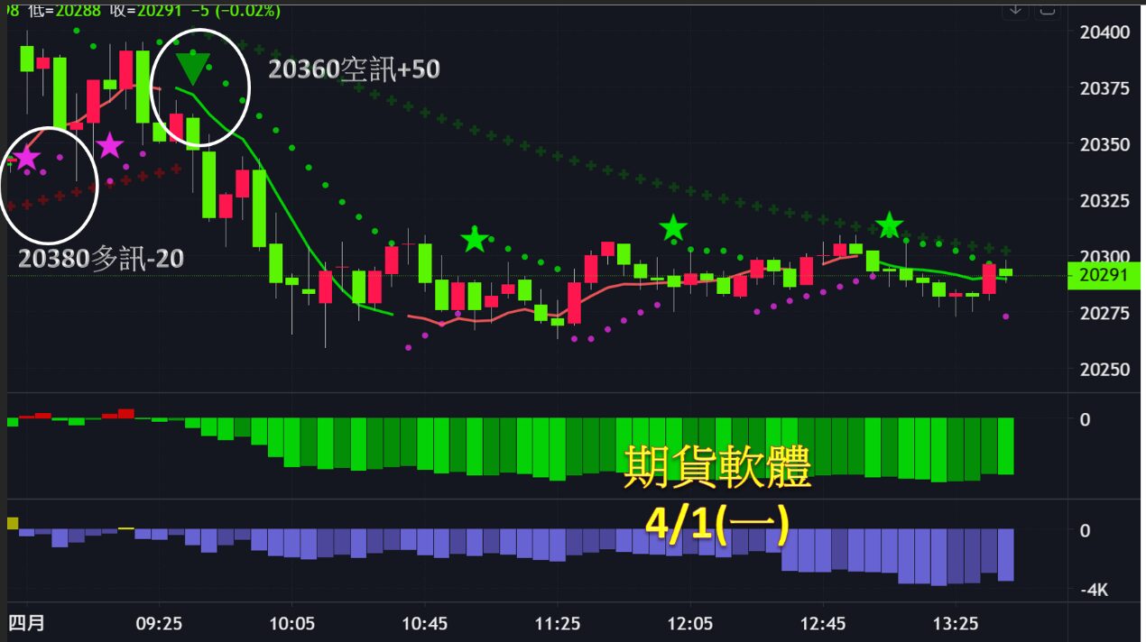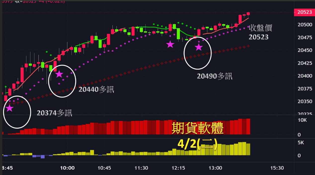 第一、二次於早盤20374、20440點出現多訊作多,直至多空力道線翻綠出場,可分別獲利106、40點;