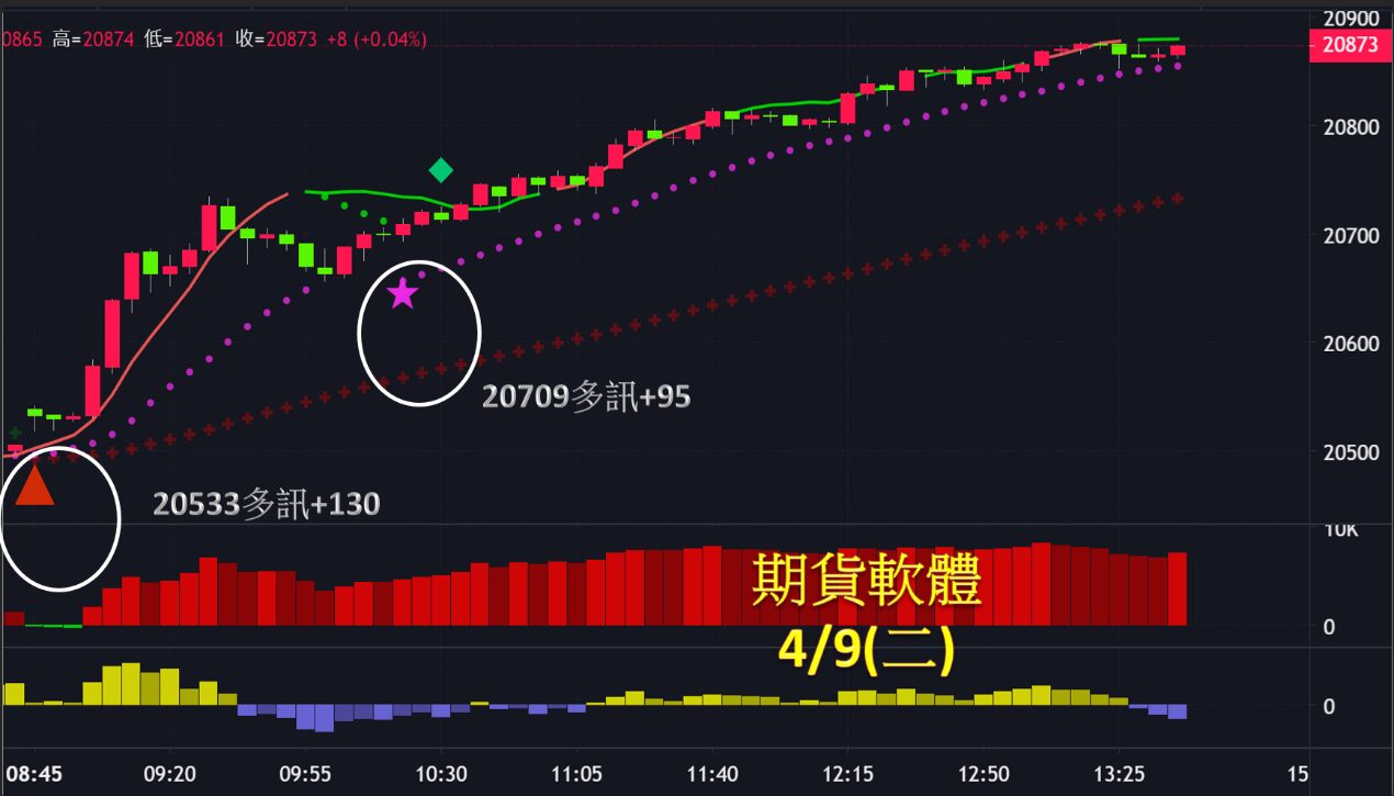 台指期今日偏多走勢一路向上,共出現2次進場機會,第一次於開盤20533點出現多訊作多,直至多空力道線翻綠出場,可獲利高達130點;第二次於隨後的20709點出現多訊作多,直至接近收盤前以市價出場,獲利約95點;總計今日操作獲利共225點。