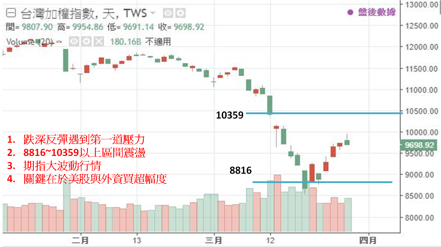 壓力暫時看10359點以上是3/12的低點起跌