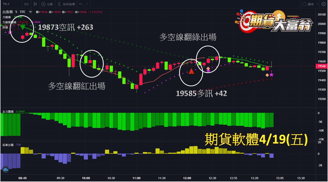 台指期今日走勢偏弱一路向下,共有2次操作機會,第一次於開盤19873點出現空訊作空,至多空線翻紅出場,可大幅獲利263點;第2次於午盤19585點出現多訊作多,至多空線翻綠出場,獲利42點;總計今日操作共可獲利高達305點。