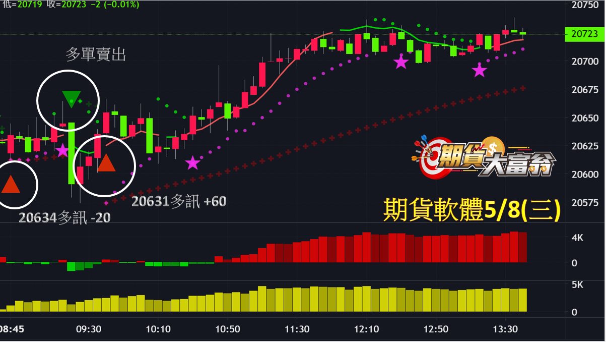 台指期今日走勢震盪向上,共出現2次操作機會,第1次於開盤20634點出現多訊作多,至綠色三角形空訊出場,小虧20點;第2次於隨後的20631點出現多訊作多,至多空線翻綠出場,獲利60點,總計今日操作共可獲利40點。