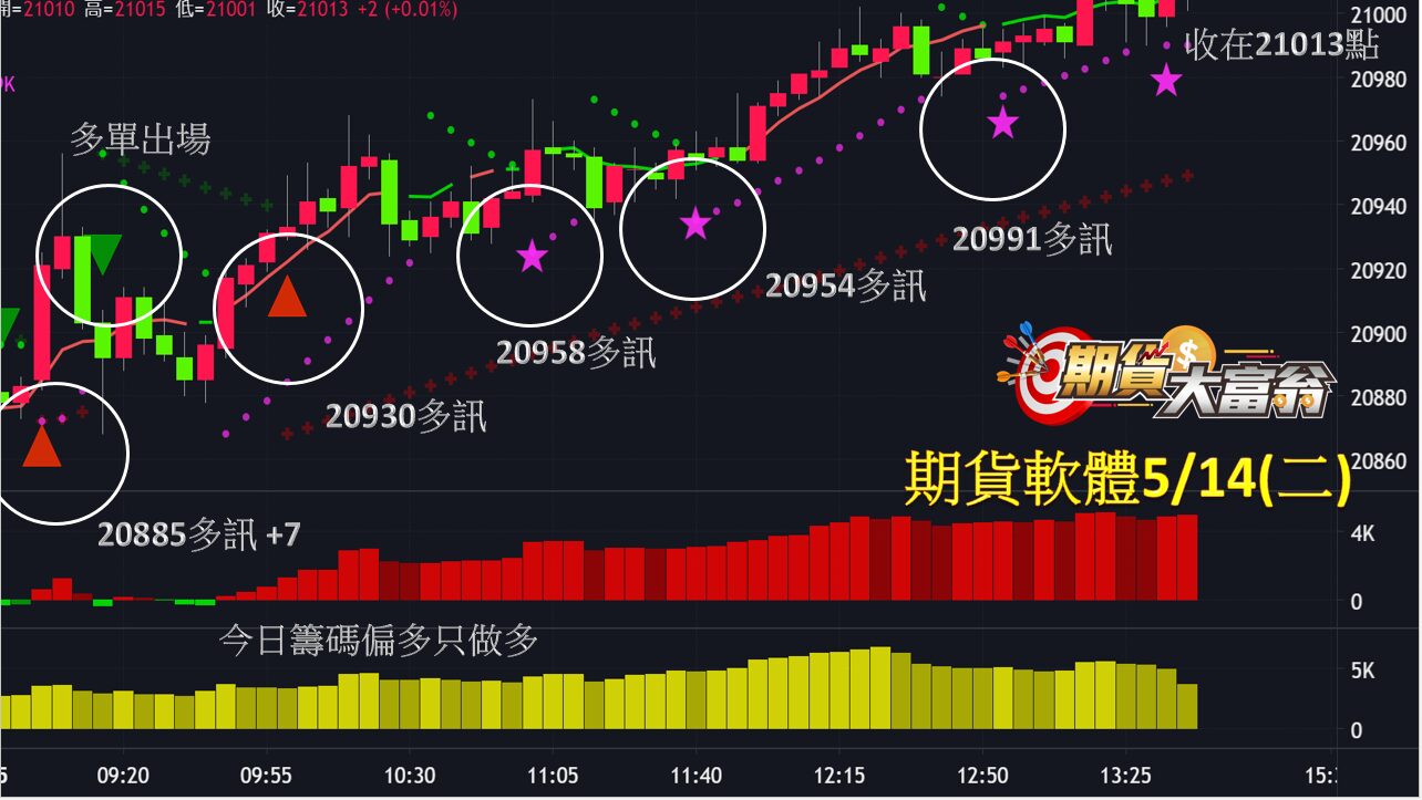 台指期今日走勢震盪向上,共出現5次進場機會,第1次於開盤20885點出現多訊作多,至綠色三角形空訊出現多單出場,小賺7點;第2次於隨後的20930點出現多訊作多,並於隨後3個加碼多訊20958、20954、20991點加碼,直至收盤21013點。