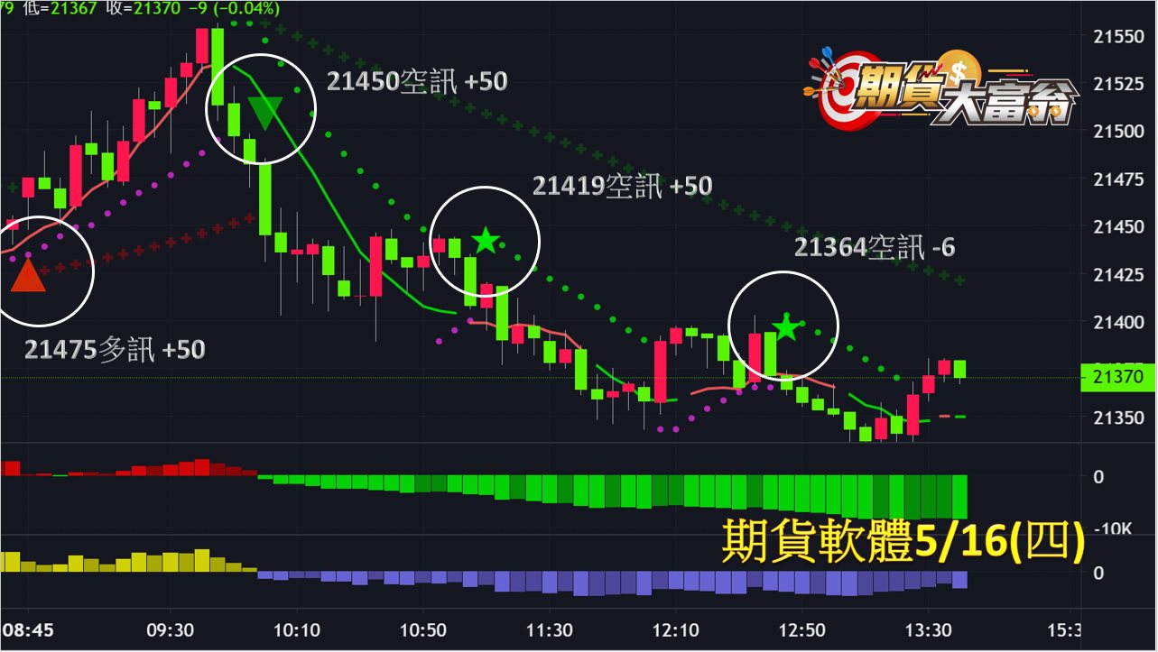 台指期今日走勢先上後下,共有4次進場機會,第1次於早盤21475點出現多訊作多,至多空線翻綠出場,獲利50點;第2次於隨後的21450點出現空訊作空,獲利50點;第3次於21419點再出現空訊進場作空,至多空線翻紅回補,獲利50點;第4次於21364點再出現空訊進場作空,至接近收盤前以市價回補,小虧6點,統計今日操作共可獲利達144點。
