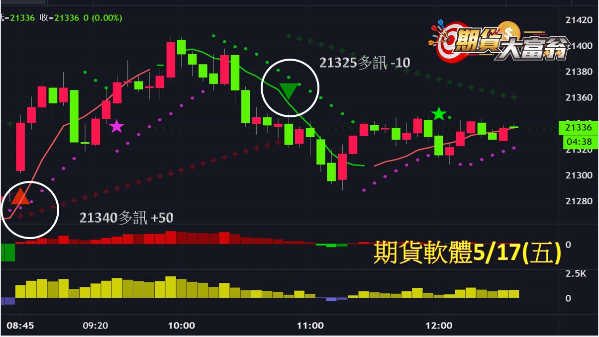 台指期今日走勢先上後下,共有2次進場機會,第1次於開盤21340點出現多訊作多,至多空線翻綠出場,獲利50點;第2次於隨後的21325點出現空訊作空,小虧10點,統計今日操作共可獲利40點。